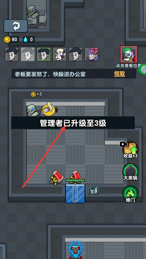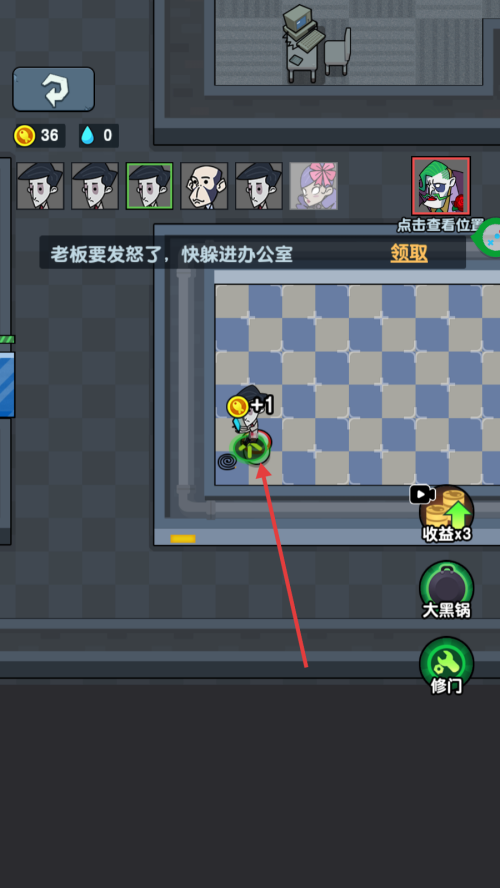 2、当显示【老板要发怒了,快躲进办公室】且倒计时【26】时,操控角色快速移动至安全区域。