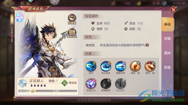 3、雷霆赵云:突击型,职业激活后战斗初始额外获得怒气。