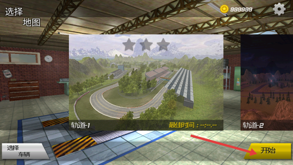 2、进入地图界面,选【轨道1】后点击【开始】,进入赛道。