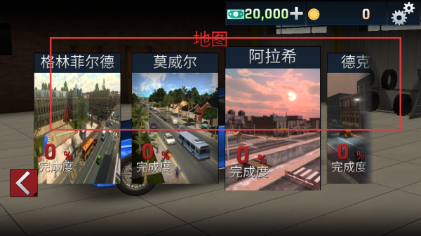 3、进入地图界面,选择【格林菲尔德】【莫威尔】等地图,开启驾驶挑战。