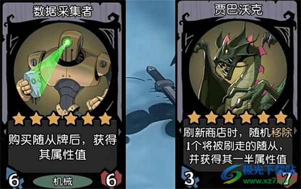 2、在6本有两张新卡牌,一张是机械的数据收集者购买随从后获得其属性值和一条绿龙,刷新商店后随机将其中一个随从的一半属性加到他身上,通过这两张牌后期能获得很高的属性值,是商店刷新流的主要输出角色。