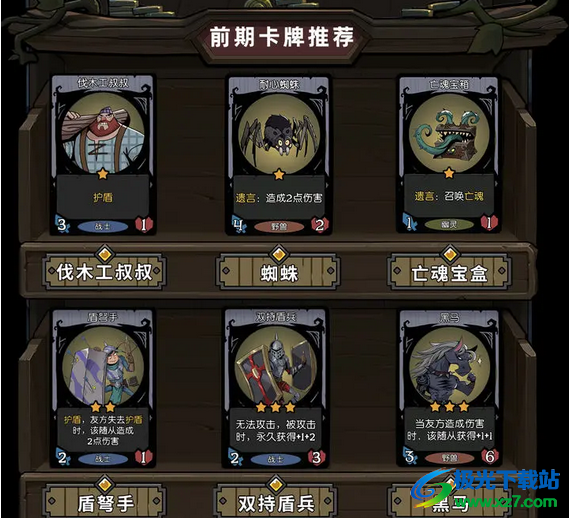 3、前期推荐卡牌:伐木工叔叔、耐心蜘蛛、亡魂宝箱、盾弩手、双持盾兵、黑马。