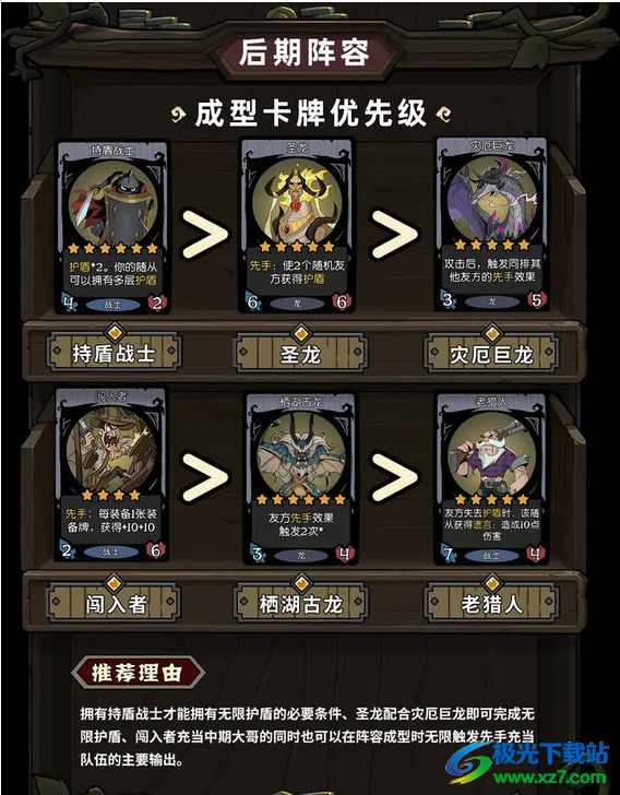 4、成型卡牌优先级:持盾战士>圣龙>灾厄巨龙>闯入者>栖湖古龙>老猎人。