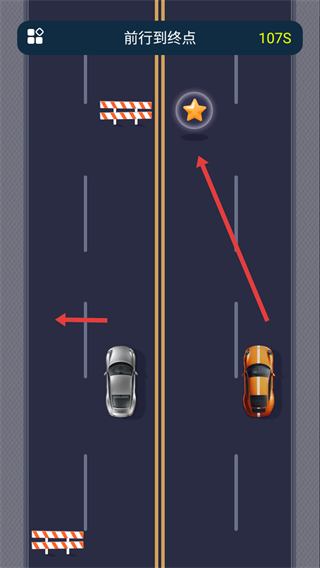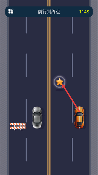 4、根据路面情况及时地变道,同时要收集【黄色星星】,躲避障碍并向终点前行。