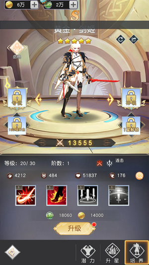 2、黄金-剑姬:优秀的前排输出战士,擅长连击造成持续伤害,火属性也注定了伤害不俗。