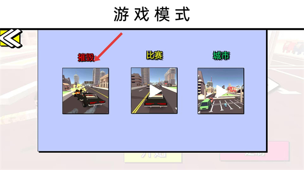 2、进入【游戏模式】选择界面,可挑选【摧毁】【比赛】【城市】任一模式,选定对应模式后即可开启对应玩法。