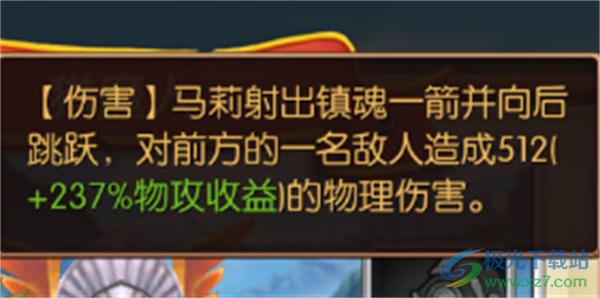2、镇魂弩:【伤害】马莉射出镇魂一箭并向后跳跃,对前方的一名敌人造成512(+237%物攻收益)的物理伤害。