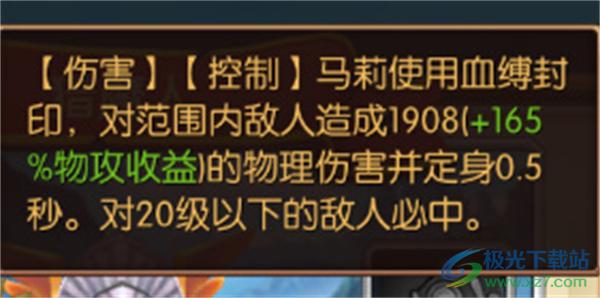 3、血缚咒弩:【伤害】【控制】马莉使用血缚封印,对范围内敌人造成1908(+165%物攻收益)的物理伤害并定身0.5秒。对20级以下的敌人必中。
