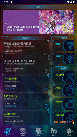 游戏王ygomobile最新版是一款非常好玩的卡牌策略对战游戏,由知名动漫《游戏王》游戏王为基础而改编,继承了其核心的玩法上,由玩家通过不断的抽取并打出卡牌来与其他玩家进行对战,超多不同的卡牌类型,怪兽卡,魔法卡,陷阱卡都将为游戏带来极大的乐趣,精美的画风完美还原了各种经典卡牌,为了获得战斗胜利,需要玩家充分运用各种策略,将手中的卡牌完美发挥最大的作用,喜欢的玩家千万不要错过。