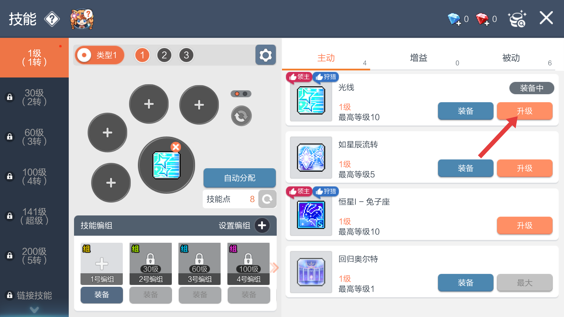 2、在技能界面里,优先给【光线】等主动技能点击【升级】,好好分配技能点,让技能威力最大化呀。