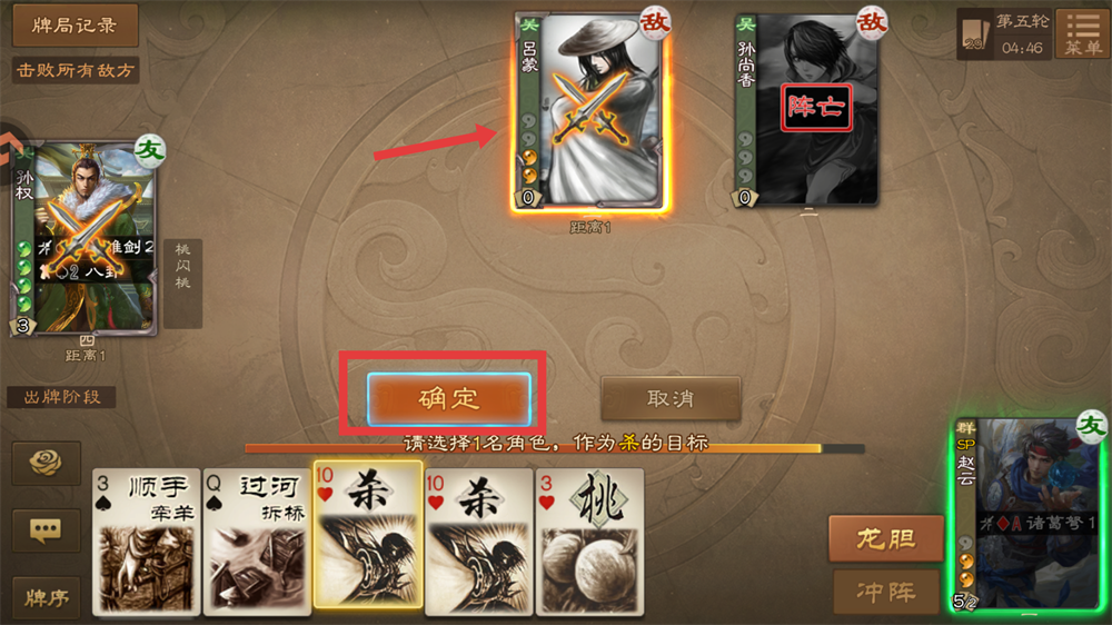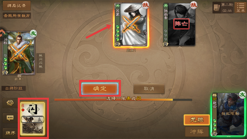 1、点击【龙胆】,赵云可将手牌中【闪】当做【杀】使用,以此攻击敌方吕蒙。