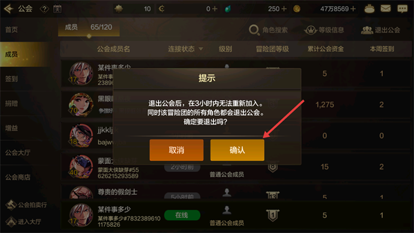 4、在提示弹窗中点击【确认】,完成退出公会操作,需注意退出后3小时内无法重新加入。