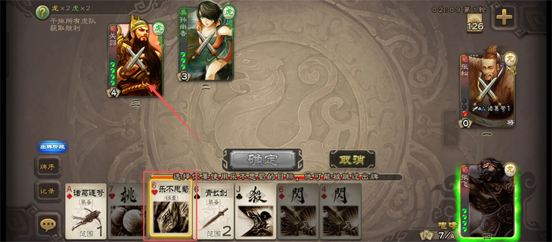 2、出牌阶段选择【乐不思蜀】,对敌方关羽使用,使其可能跳过出牌阶段,打乱敌方节奏哦。