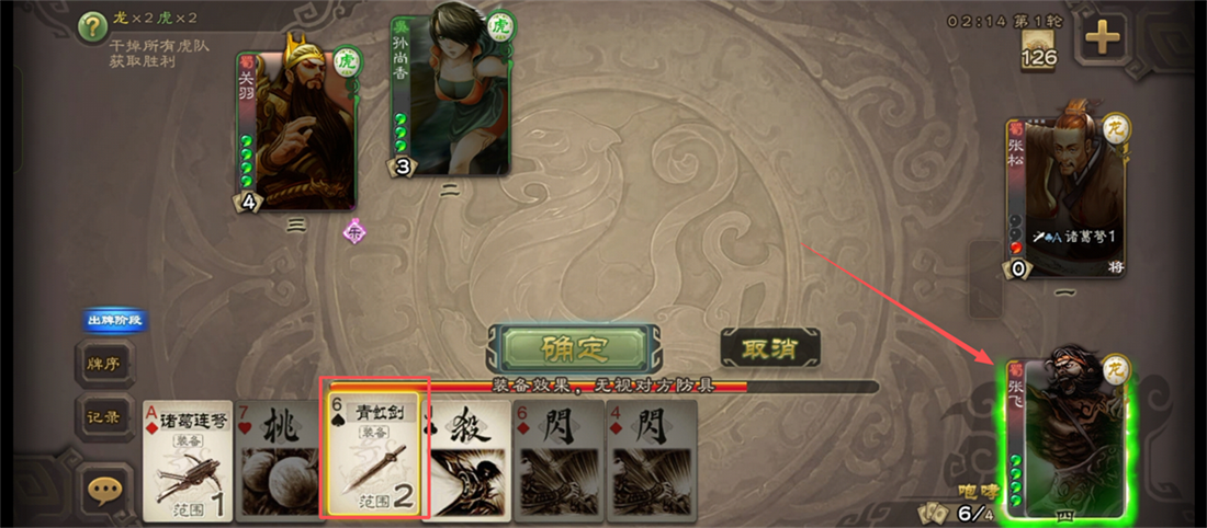 4、选择【杀】对敌方关羽使用,配合青釭剑的效果,高效发起攻击,助力快速歼灭敌人呢。