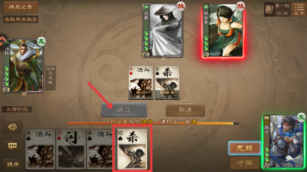 2、在与孙尚香的决斗中,我们要及时打出【杀】,点击确定,便能在决斗中不落下风呢。