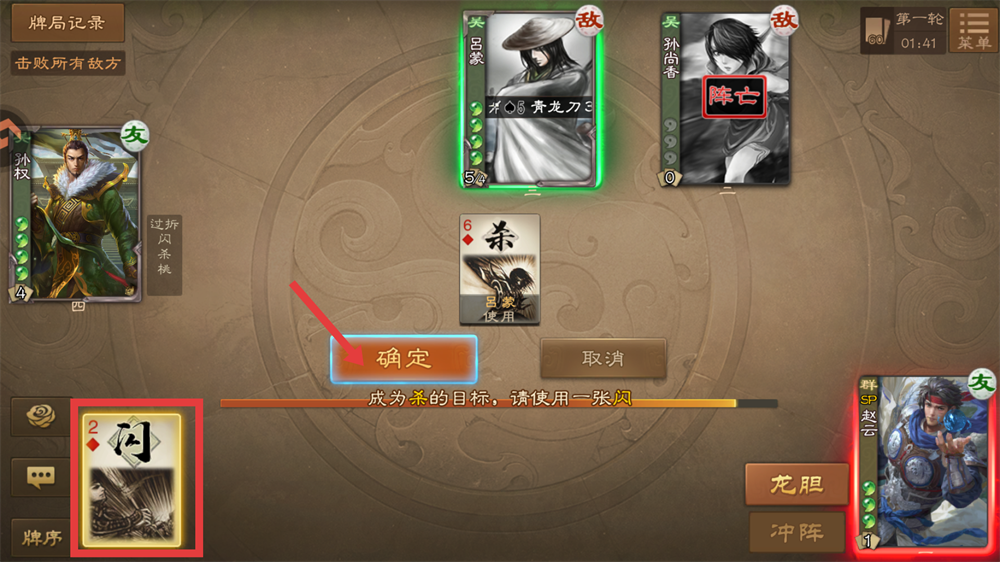 3、当吕蒙对我们出【杀】时,我们可使用【闪】规避伤害,保障自身血量呀。