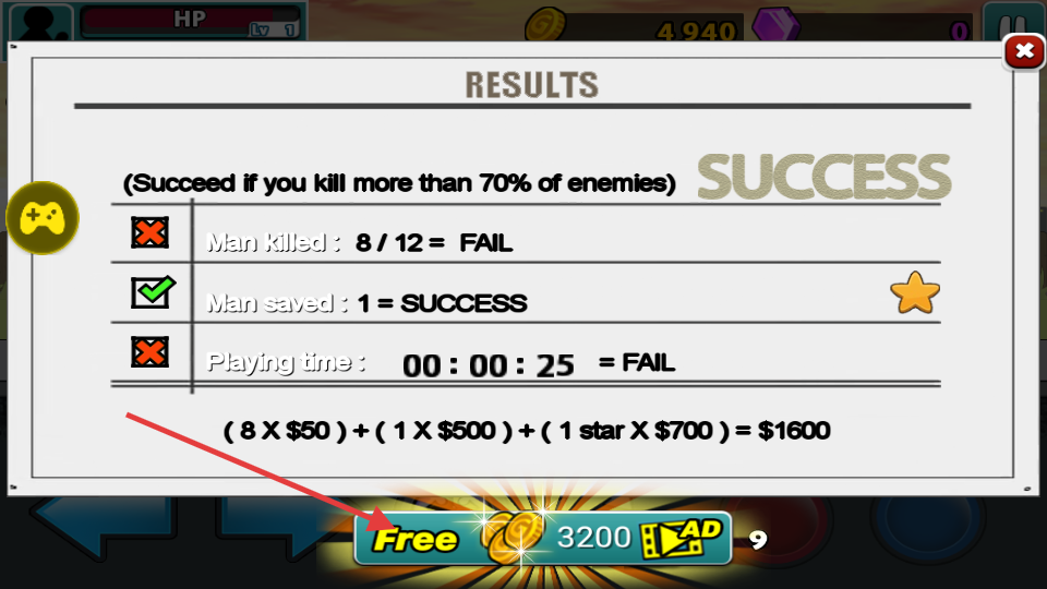 4、完成任务后,可查看结果界面,根据消灭敌人数量获得金币奖励。