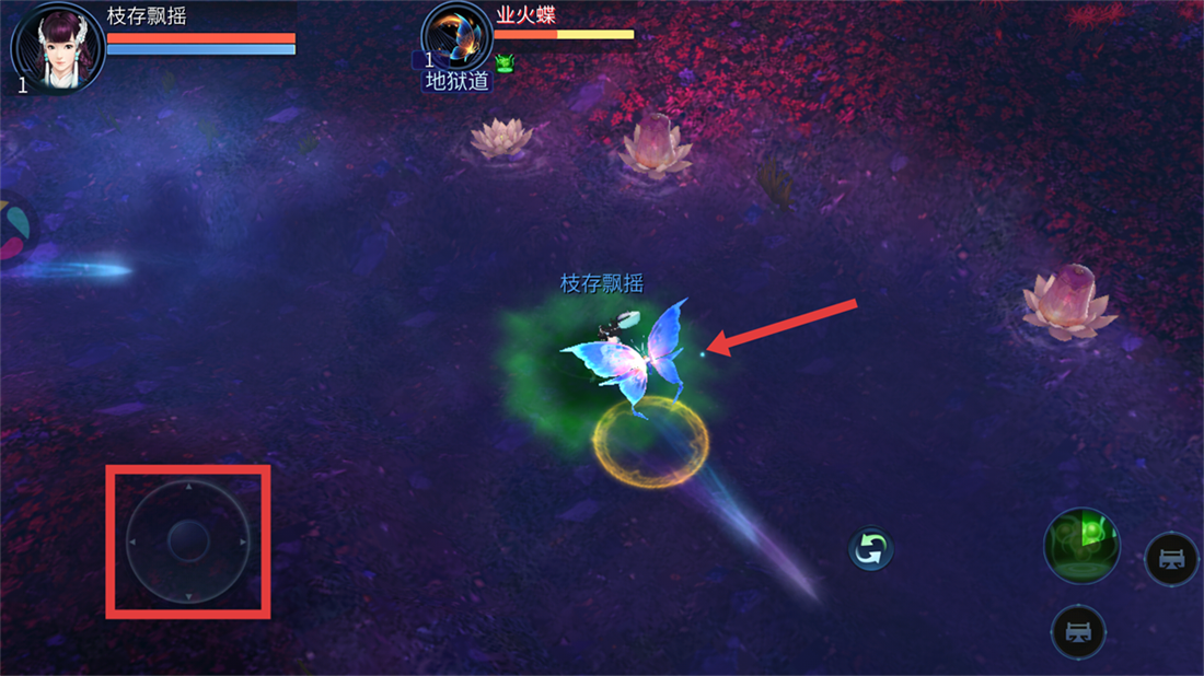 3、战斗时通过左下角虚拟摇杆控制角色移动,灵活走位躲避【业火蝶】攻击,同时找准时机发起反击。