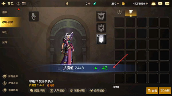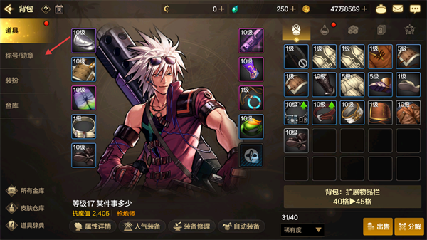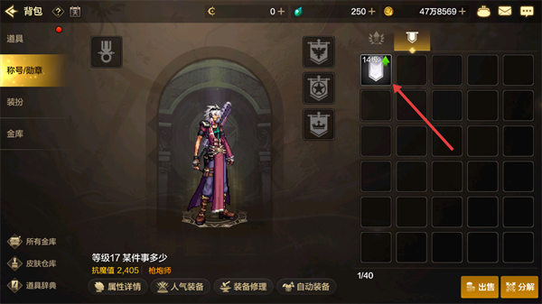 1、在背包界面点击【称号/勋章】,进入专属界面。