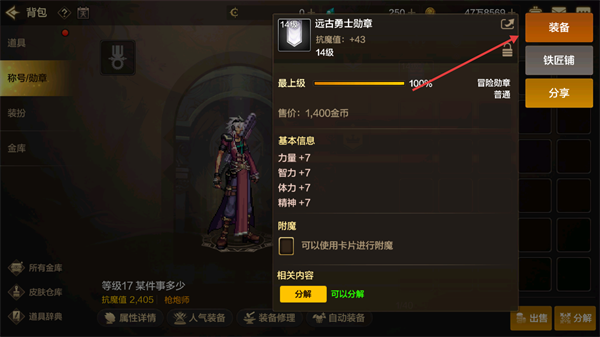 3、点击勋章后选择【装备】,完成勋章穿戴操作。