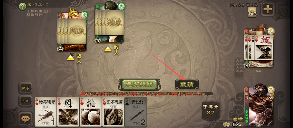 3、开局换牌时,若手牌不错就点【取消】,保留优质手牌,合理利用换牌次数呢。