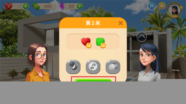 1、点击绿色箭头进入关卡,推进房屋装饰进度。