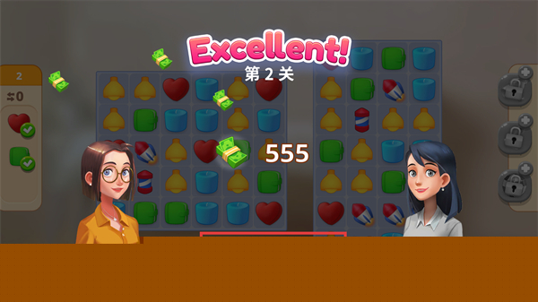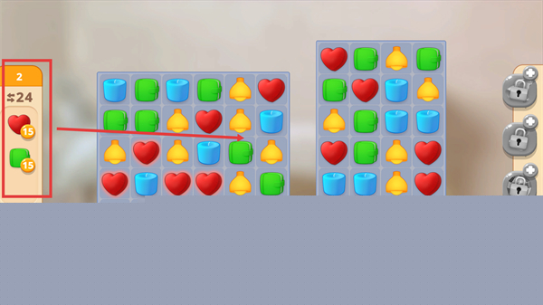 3、消除【爱心】和【绿色物品】图标,快速完成左侧进度条目标,推进关卡进程。