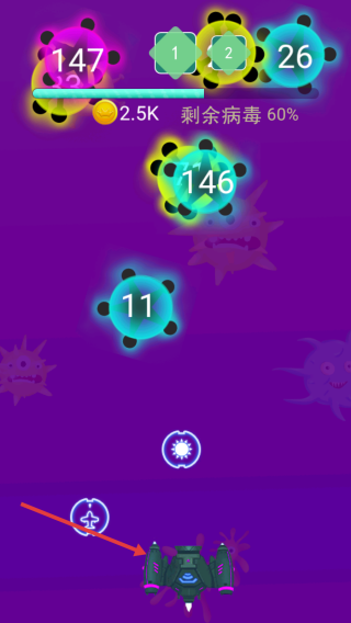2、游戏中,操控飞船射击屏幕上的病毒,收集金币。