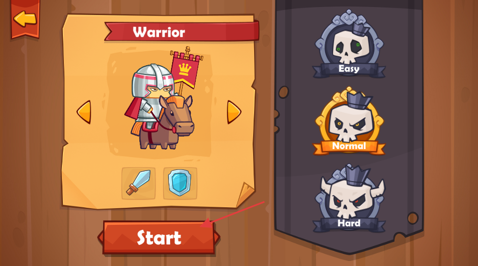 2、在角色与难度选择界面,确认选择“Warrior”角色后,点击【Start】按钮,进入游戏关卡界面。