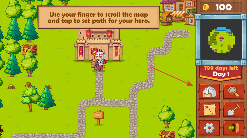 3、在游戏关卡界面,按照提示用手指滑动地图,点击设置英雄路径,利用右侧功能按钮进行相关操作,推进游戏进程。