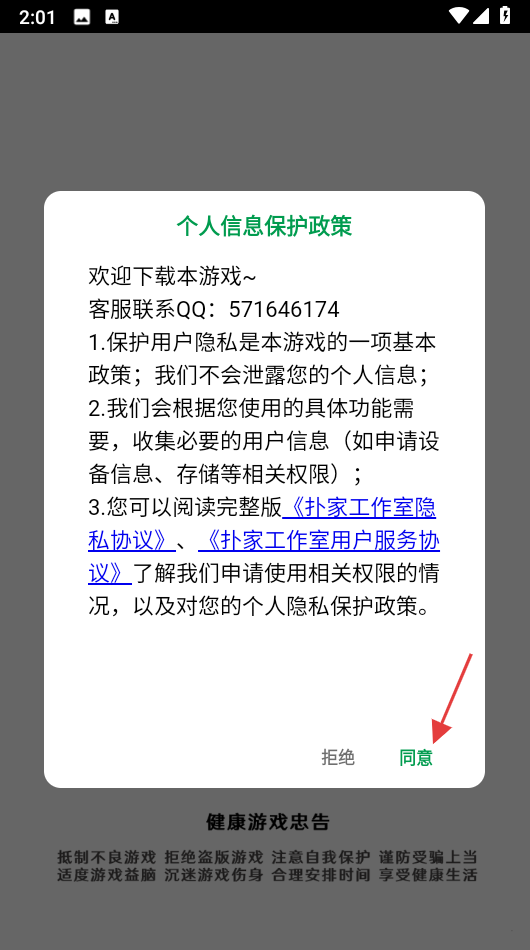 1、在个人信息保护政策界面,点击【同意】按钮,接受相关政策,进入健康游戏提示界面。