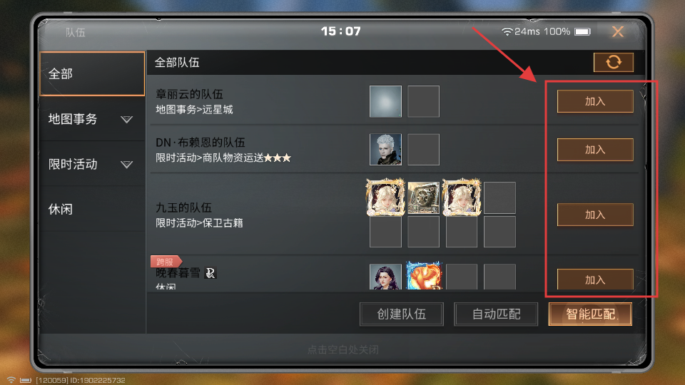 2、选择【加入队伍】,进入队伍列表界面。