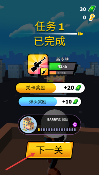 3、任务完成后,点击【下一关】,领取奖励并开启新射击任务。