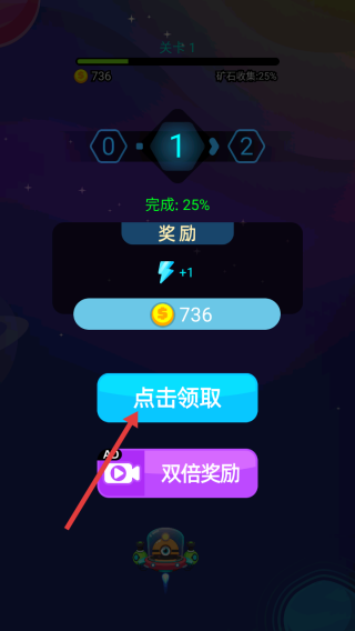 3、关卡结束后,点击蓝色【点击领取】按钮,获取闪电和金币奖励。