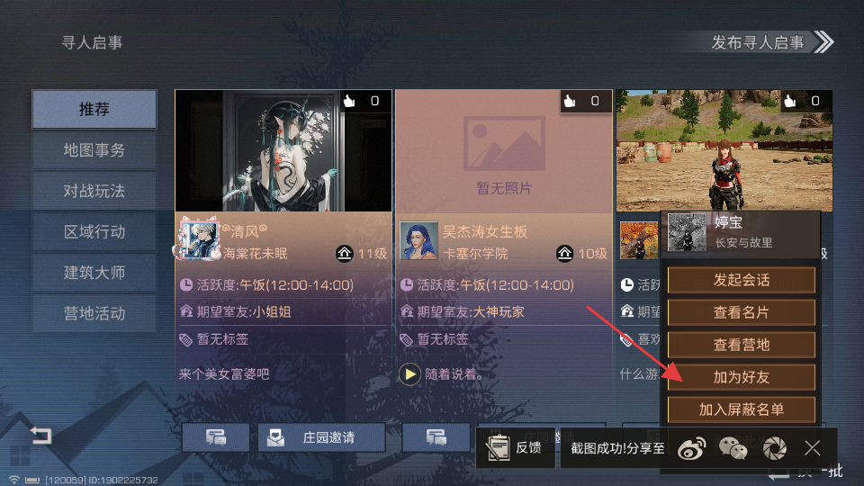 3、在寻人启事的推荐列表中,选择目标玩家。