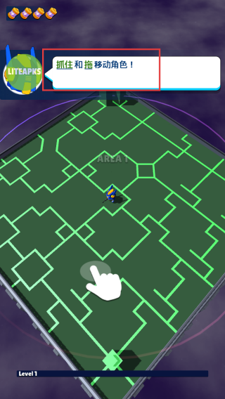 3、进入游戏关卡,会收到【抓住和拖移角色!】提示,按照指引拖动角色在迷宫地图移动。