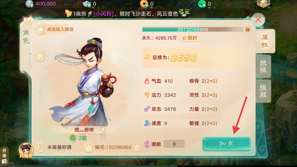 2、在角色界面,点击【加点】,进入属性加点界面。