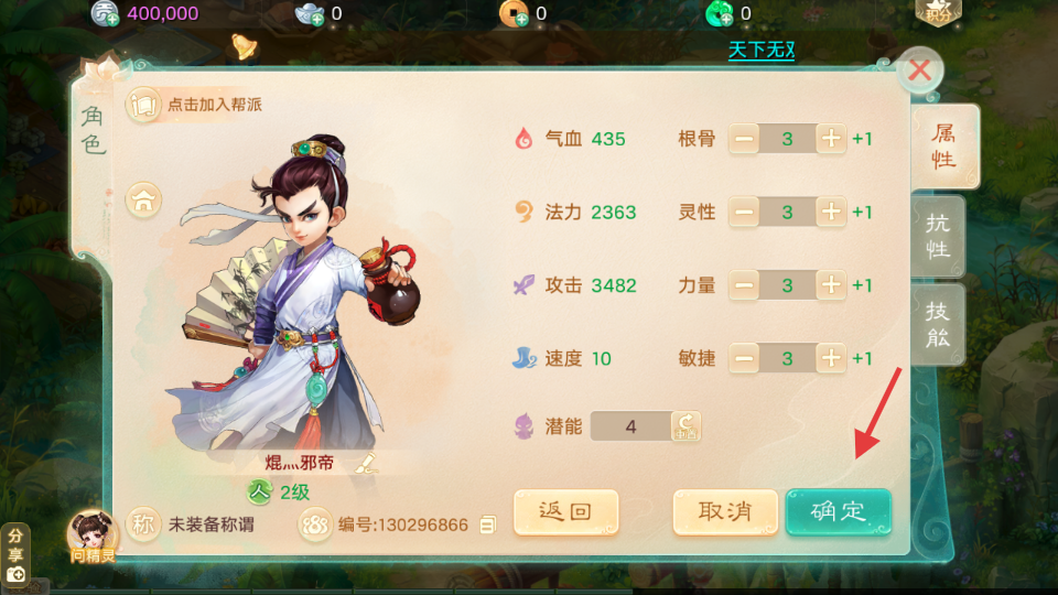 4、调整完成后,点击【确定】,完成角色属性加点操作。