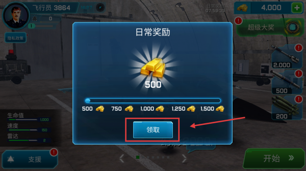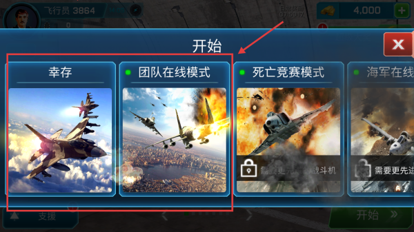 2、点击左右箭头可以更换战机,选择好后点击【开始】即可,还有更高级的战机待你来解锁。