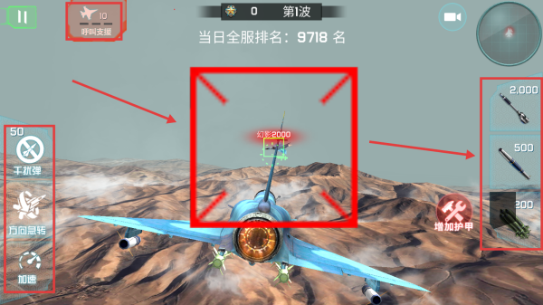 4、在【幸存】模式中,我们需要击败尽可能多的敌人,拖动屏幕调整瞄准方向,瞄准敌方战机后点击发射导弹,还可以用释放干扰弹、加速等操作灵活躲避敌方进攻,随后乘胜追击。
