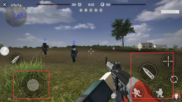 3、左侧虚拟摇杆控制移动,右侧按钮操作射击、技能,参与战场战斗。