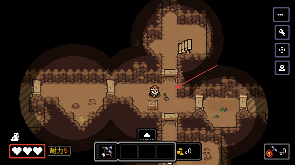 1、在迷宫地图中操控角色移动,靠近互动点如工具处,推进地牢探索。