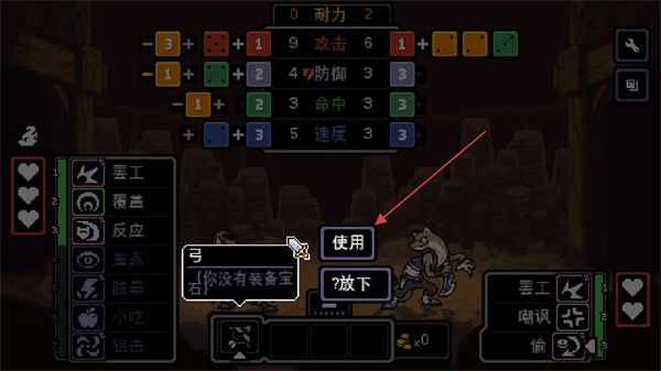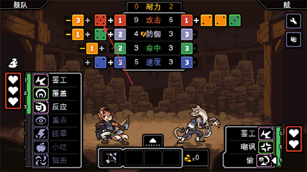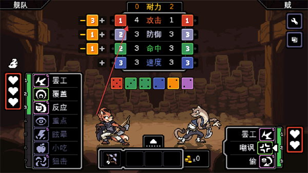 2、进入战斗界面后,通过左侧技能如罢工搭配骰子,调整属性攻击、防御等数值。