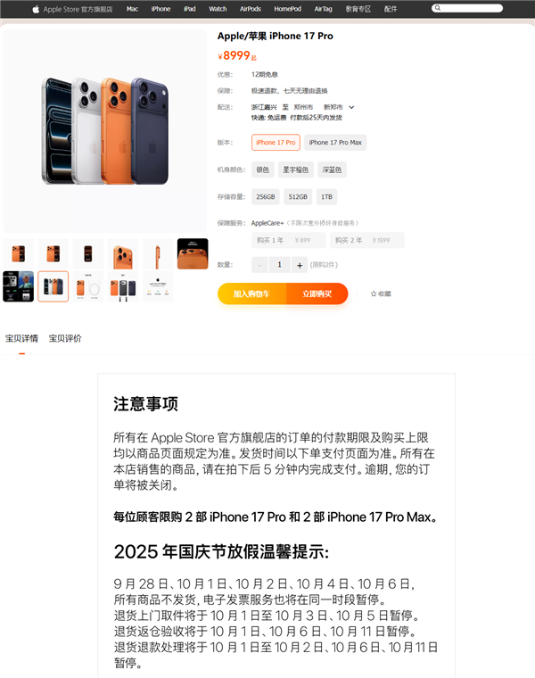 苹果电商旗舰店国庆放假:五天时间iPhone 17等所有商品不发货