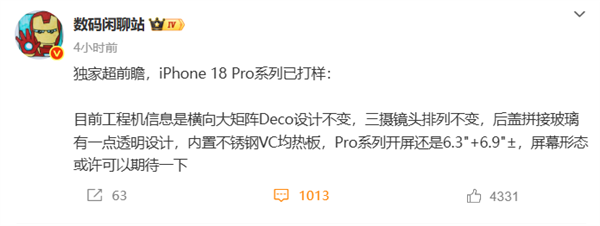 iPhone 18 Pro已打样:镜头Deco设计不变 内置不锈钢VC均热板