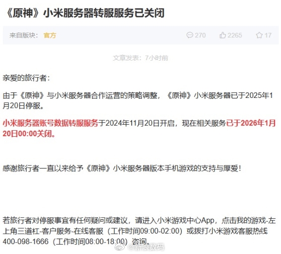 正式停服!米哈游:《原神》小米服务器转服服务已关闭